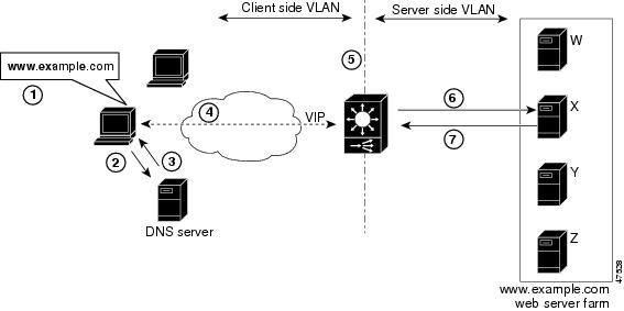 A client sends a request to one of the module's VIP addresses. The CSM forwards this request to a server that can respond to the request. The server then forwards the response to the CSM, and the CSM forwards the response to the client.