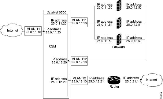 For regular firewalls, a single CSM or a pair of CSMs balances traffic among firewalls that contain unique IP addresses, similar to how the CSM balances traffic to servers.