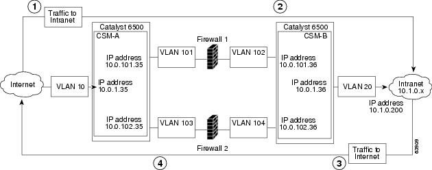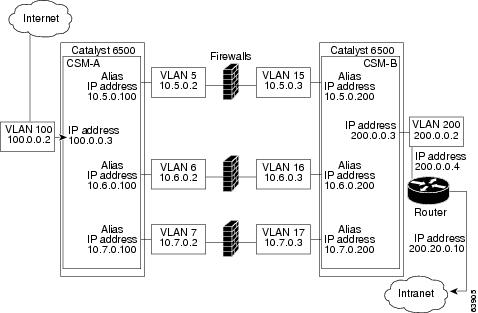 In Figure 11-1, traffic moves through the firewalls and is filtered in both directions. The figure shows the flow from the Internet to the intranet. On the path to the intranet, CSM A balances traffic across VLANs 5, 6, and 7 through firewalls to CSM B. On the path to the Internet, CSM B balances traffic across VLANs 15, 16, and 17 through firewalls to CSM A. CSM A uses the VLAN aliases of CSM B in its server farm, and CSM B uses the VLAN aliases of CSM A in its server farm.