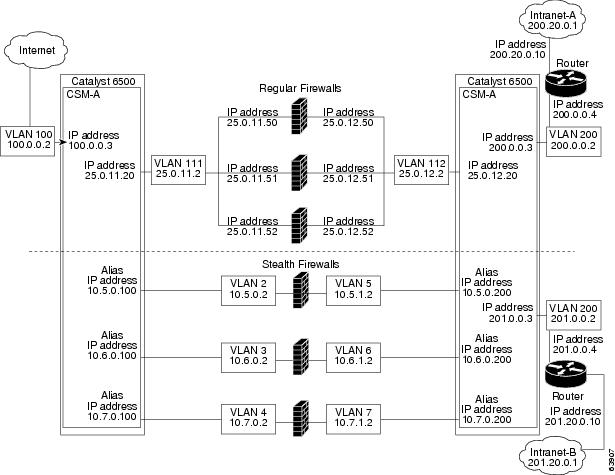 For stealth firewalls, a CSM balances traffic among unique VLAN alias IP address interfaces on another CSM that provides paths through stealth firewalls. A stealth firewall is configured so that all traffic moving in both directions across that VLAN moves through the firewall.