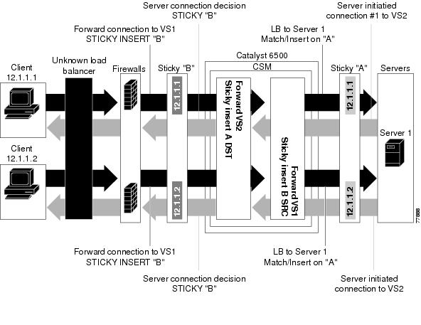 The CSM currently supports sticky connections. Sticky connections ensure that two distinct data flows originating from the same client are load balanced to the same destination.