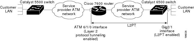 As shown in Figure 7-7, Layer 2 Protocol Tunneling (L2PT) is configured at the Cisco 7600 ATM 6/1/0 interface and also at the Catalyst 6500 switch Gig 2/1 interface.