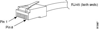 You can identify a rollover cable by comparing the two ends of the cable. Holding the cables side by side, with the tab at the back, the wire connected to the pin on the outside of the left plug should be the same color as the wire connected to the pin on the outside of the right plug. (See Figure A-20.) If your cable was purchased from Cisco Systems, pin 1 will be white on one connector, and pin 8 will be white on the other. (A rollover cable reverses pins 1 and 8, 2 and 7, 3 and 6, and 4 and 5.)