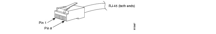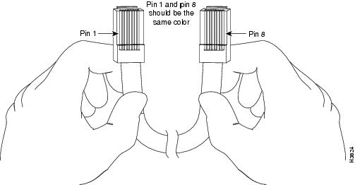 You can identify a rollover cable by comparing the two ends of the cable. Holding the cables side-by-side, with the tab at the back, the wire connected to the pin on the outside of the left plug should be the same color as the wire connected to the pin on the outside of the right plug. (See Figure B-1.) If your cable was purchased from Cisco Systems, pin 1 will be white on one connector, and pin 8 will be white on the other (a rollover cable reverses pins 1 and 8, 2 and 7, 3 and 6, and 4 and 5).