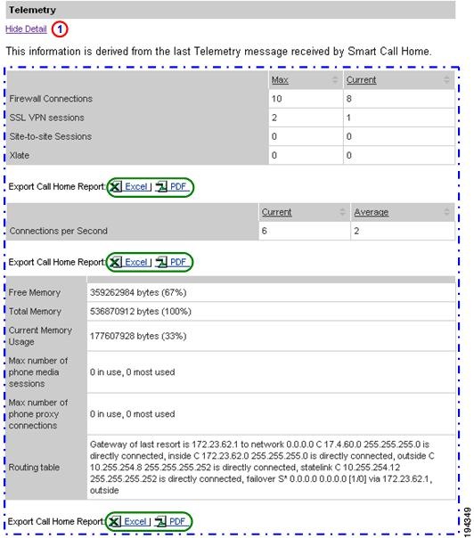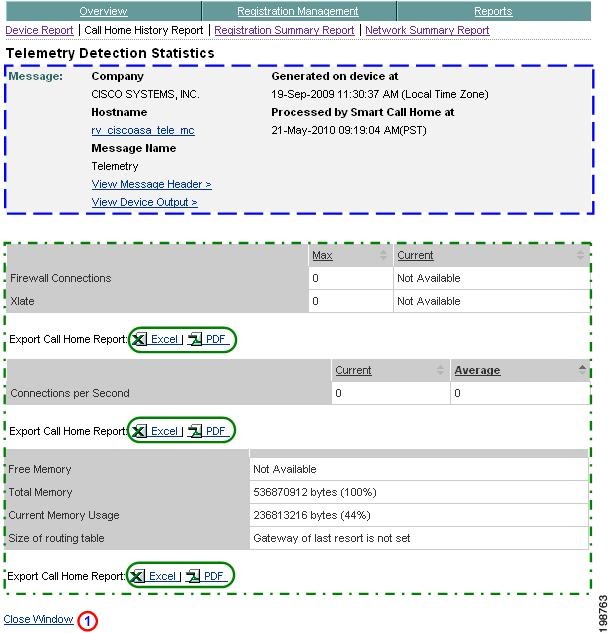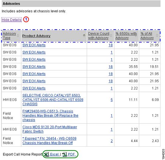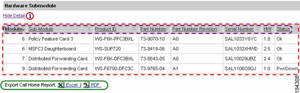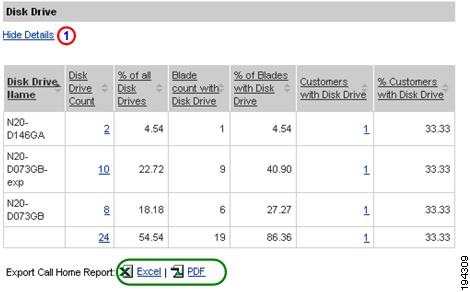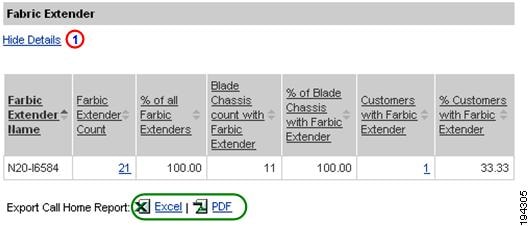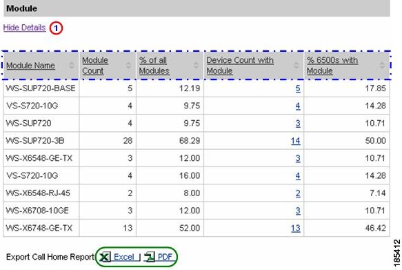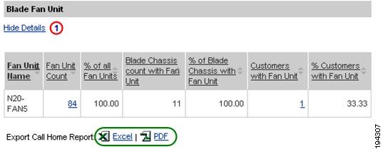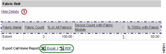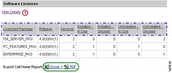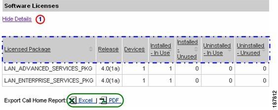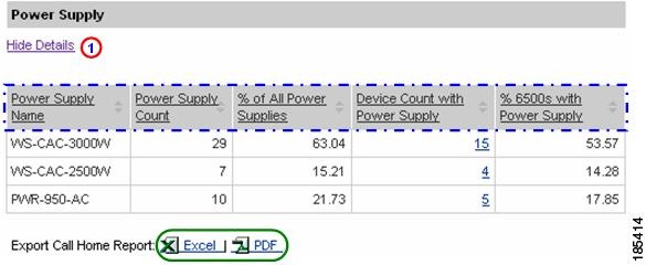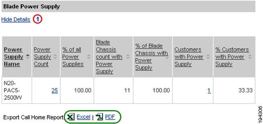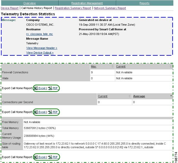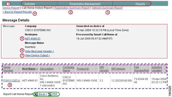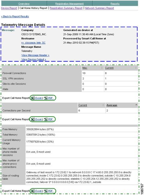 Numerous pages on both Device Reports and Call Home History Reports have an Export Call Home Report function, which lets you export the report information on the current page to either an Excel or a PDF format.
