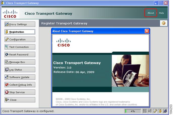 The about information lets you verify the release date of the Transport Gateway code; perform the following steps:
