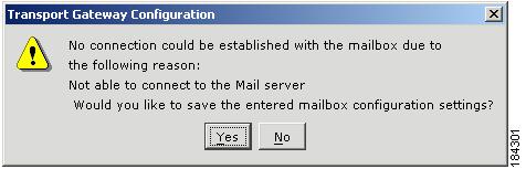 During configuration of the Transport Gateway, you want a connection to the mail server's Inbox but get the following warning message when trying to establish a connection