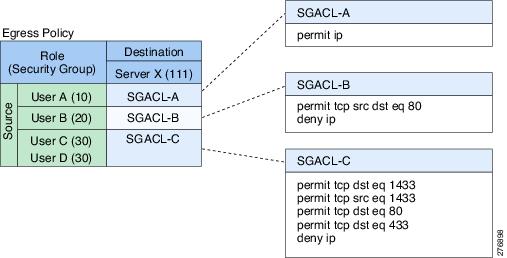 Cisco TrustSec uses ingress tagging and egress filtering to enforce access control policy in a scalable manner. Packets entering the domain are tagged with a security group tag (SGT) containing the assigned security group number of the source device. This packet classification is maintained along the data path within the Cisco TrustSec domain for the purpose of applying security and other policy criteria. The final Cisco TrustSec device on the data path, either the endpoint or network egress point, enforces an access control policy based on the security group of the Cisco TrustSec source device and the security group of the final Cisco TrustSec device. Unlike traditional access control lists based on network addresses, Cisco TrustSec access control policies are a form of role-based access control lists (RBACLs) called security group access control lists (SGACLs).