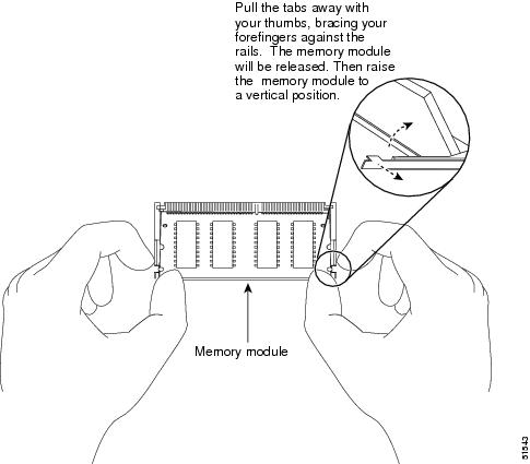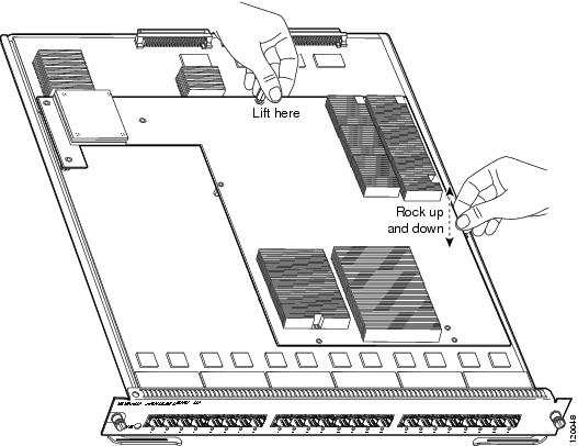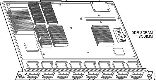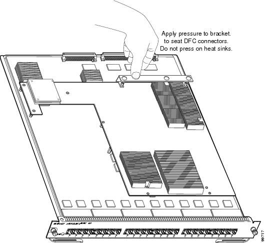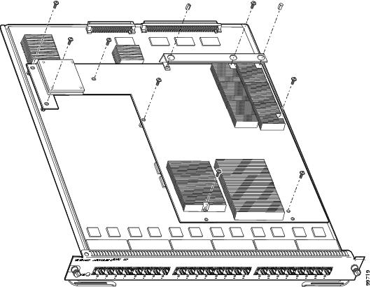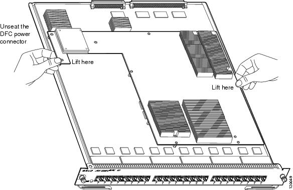 For the WS-F6700-DFC3A, WS-F6700-DFC3B, and WS-F6700-DFC3BXL, the memory module is located on the base WS-X67xx module, under the DFC3. To upgrade the DFC3 memory, you must first remove the DFC3 from the module.