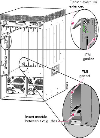 Step 7 Carefully slide the supervisor engine into the slot until the EMI gasket along the right edge of the supervisor engine makes contact with the module in the slot adjacent to it and both ejector levers have closed to approximately 45 degrees with respect to the supervisor engine faceplate. (See Figure 16.)