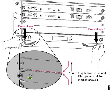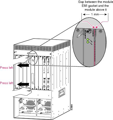 Note If the captive installation screws are loose, the EMI gaskets on the installed modules will push adjacent modules toward the open slot, reducing the opening size and making it difficult to install the replacement module.