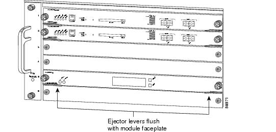 d. While pressing down, simultaneously close the left and right ejector levers to fully seat the supervisor engine or module in the backplane connector. The ejector levers are fully closed when they are flush with the module faceplate. (See Figure 3.)